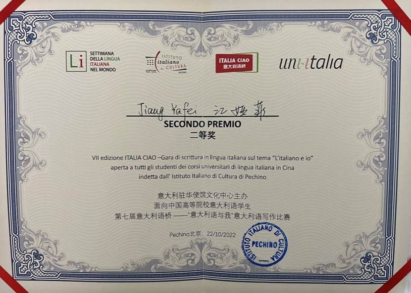 19级江娅菲同学获得第七届全国意大利语桥写作比赛二等奖