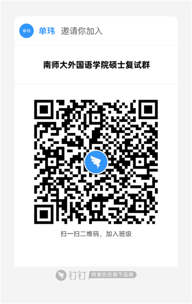 为了确保信息畅通,请使用手机安装“钉钉”应用,然后打开“扫一扫”扫描以下二维码进入皮皮虾 “钉钉”复试群,入群时需实名验证(专业名称+姓名+成绩总分)。学院会在复试群里发布与复试相关的各种信息,请务必于2020年5月15日前扫码加入,二维码可在附件中下载。