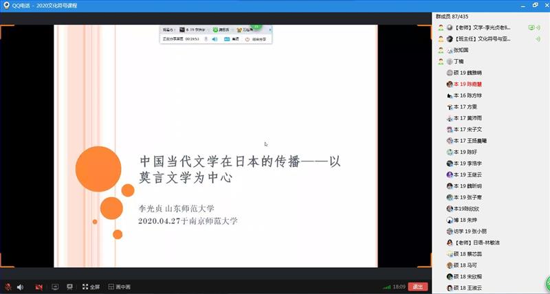 副院长王永祥教授主持的“文化符号与亚洲共同体”研究项目系列讲座第四讲在线上顺利召开。讲座于19:00在QQ群中正式展开。讲座由王永祥教授主持,山东师范大学的李光贞教授主讲,李老师进行了题为“中国当代文学在日本的传播----以莫言文学为中心”的精彩演讲。QQ群中400多名南师大外院青年教师、硕博研究生和本科生准时上线,一起聆听了这场精彩的讲座。