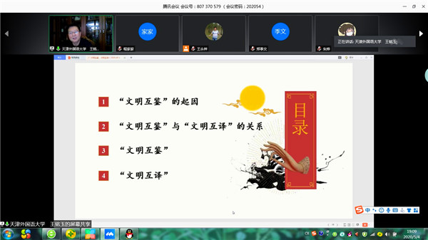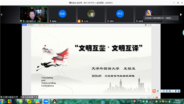 副院长王永祥教授主持的“文化符号与亚洲共同体”研究项目系列讲座第六讲在线上顺利召开。讲座于19:00在腾讯会议APP上正式展开。讲座由王永祥教授主持,天津外国语大学的王铭玉教授主讲,王教授进行了题为“文明互鉴·文明互译”的精彩演讲。QQ群中400多名南师大外院青年教师、硕博研究生和本科生准时上线,一起聆听了这场精彩的讲座。