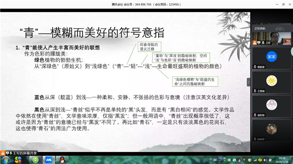副院长王永祥教授主持的“文化符号与亚洲共同体”研究项目系列讲座第十三讲以在线形式顺利召开。此次讲座于19:00-21:00在腾讯会议APP上展开,由王永祥教授主持,苏州大学王军教授作为主讲嘉宾,以“‘青’:汉语文化符号的样板”为题进行了精彩演讲。QQ群中400多名南师大外院教师,本科生以及硕博研究生准时上线,聆听了本场讲座。
