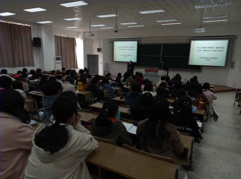 郑书九教授先从当今我国高校西班牙语教育现状入手,分析了我国现阶段高校西班牙语专业的开设情况、师资配比和专业人数,说明了我国西语教育快速发展的同时也面临一系列的困难与挑战,尚存在一系列亟待解决的问题。郑教授指出,西语教学尚缺少一套或若干套完整、系统、科学、具有改革思路、与现代信息社会发展相适应的本科教学教材。随后郑教授介绍到,在他长达25年的文学教学中,一直将“翻转课堂”的理念付诸实践,即学生成为教与学的主角,老师与学生共同完成课程学习的模式。最后郑教授向我们介绍了他在编写《拉丁美洲文学教程》时所做的尝试与突破。讲座结束后,针对同学提出的问题,郑教授向同学们表达了在拉美文学阅读过程中掌握正确方法的重要性。整场讲座历时2小时,令全体西语专业师生受益匪浅。