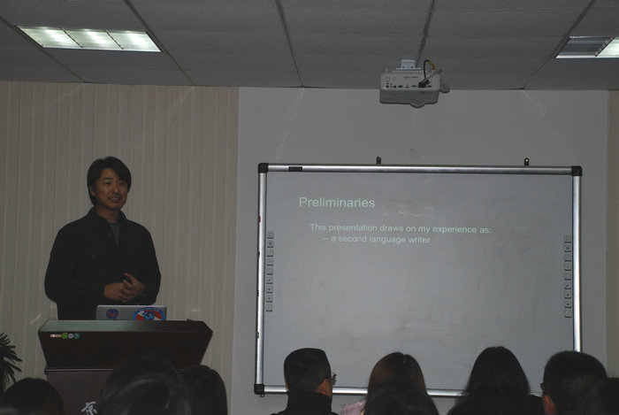 Paul Kei Matsuda教授首先介绍了自己写作论文的经历及相关经验和心得体会,逐渐带领大家进入话题。接着,Paul Kei Matsuda教授讲解了发表论文的重要性,以引起听讲者的兴趣及重视。然后教授讲了如何评价一篇论文的好坏。因为通过对一篇论文的评价,一方面可以帮助论文撰写者去如何选择质量高的参考文献,另一方面,也可以让论文作者对自己所写的论文进行自我评价病进行改正,以提高自己论文的质量。整个讲座中Paul Kei Matsuda教授重点讲解了“The CARS Model”(即,create a research space model)部分。通过这部分讲解,在场师生对如何更好为论文开题有了一个明晰的了解。之后,Paul Kei Matsuda教授通过举例的方式,让听众对所将部分有了一个更深的印象。