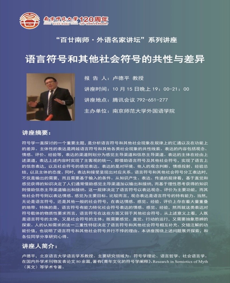 2022年10月15日晚,“百廿南师•外语名家讲坛”系列讲座在腾讯会议云端再次开讲。北京语言大学语言系卢德平教授以“语言符号和其他社会符号的共性与差异”为题,从社会背景和现象实例出发,探讨语言符号与一般社会现象规律的分析与对比,为三百余名师生带来精彩报告。本次讲座由皮皮虾
