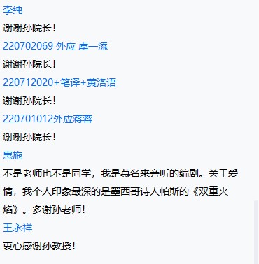 讲座中,孙勇彬教授从三个问题出发,深入讲述了《查密莉雅》中美好的爱情故事以及其所展现的爱情观,并揭示了其被称为世界最美爱情故事的原因。王永祥教授为这次讲座做了精彩的点评,他指出,这是一次很美的讲座,有着很美的故事,也让听众有非常美的感受,包括意境美、爱情美和人性美。参会师生也与孙教授进行了热烈的交流与讨论,孙教授结合自己的人生感悟,以其渊博的学识一一解答了听众的提问。本周四晚,“文化符号与亚洲共同体”系列讲座将开启第五场,讲座内容围绕着语言学和语料库研究,敬请期待。