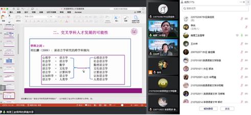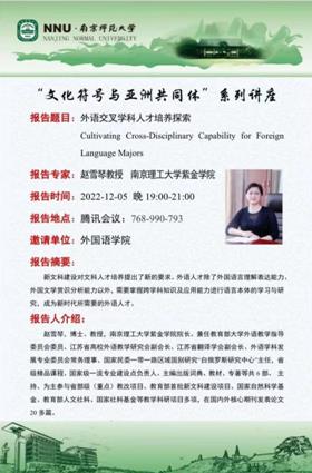 12月5日晚,依托王永祥教授的国际横向课题欧亚财团项目,“文化符号和亚洲共同体”系列讲座第十四讲在云端开讲。南京理工大学紫金学院院长赵雪琴教授以“外语交叉学科人才培养探索”为题,结合理论构建和实践应用,从交叉学科人才培养的必要性、可能性和实践性三个维度,详细讲述了新文科建设对外语人才培养提出的新要求。本场讲座由皮皮虾