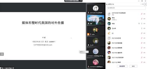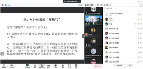 王永祥教授对本场讲座进行了精彩点评。王院长指出,辛斌教授从2008年金融危机和近几年新冠疫情的舆论背景切入,引经据典,从六个方面讲在媒体形塑时代如何做好对外传播。王院长认为,对于外语人而言,对如何传递中国智慧、传播中国故事和塑造中国形象应该更具有使命感和担当意识。最后,辛教授又与其他参会师生进行了热烈的交流和讨论。本次讲座内容精彩丰富,发人深思,兼具学术意义和思政意义,为新媒体形塑时代背景下中国对外话语的传播策略提供了借鉴与启示。下周一晚,“文化符号与亚洲共同体”系列讲座将开启第十六场,敬请期待。