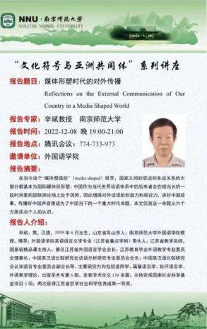 英语语言文学专业(江苏省重点学科)带头人、江苏省外国语言学会会长辛斌教授以“媒体形塑时代的对外传播”为题,详细地阐述了中国在对外传播中尚需做的一些工作。本场讲座由皮皮虾
