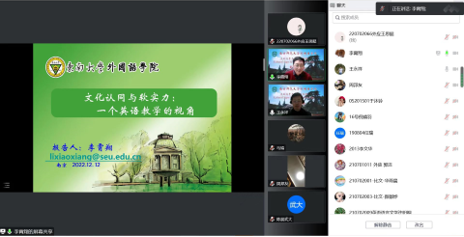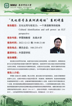 12月12日晚,依托王永祥教授的国际横向课题欧亚财团项目,“文化符号与亚洲共同体”系列讲座第十六讲在云端开讲。东南大学二级教授李霄翔以“文化认同与软实力:一个英语教学的视角”为题,结合外语教学实际,从理念和方法论的视角阐述了外语教学如何有效培养学生的多元文化意识和跨文化交际能力。本场讲座由皮皮虾