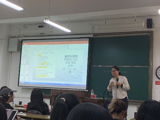 意大利语系邀请了四川外国语大学教授陈英老师为外院意大利语专业的师生作了题为“意大利诗歌文本:从翁家雷蒂到安杰利斯”的讲座。作为主要从事当代意大利文学译介与研究的学者,陈英教授通过对意大利诗歌文本的分析,将意大利现当代诗歌的魅力展现在外院学子面前。本次讲座由意大利语系主任潘艺老师担任主持人。