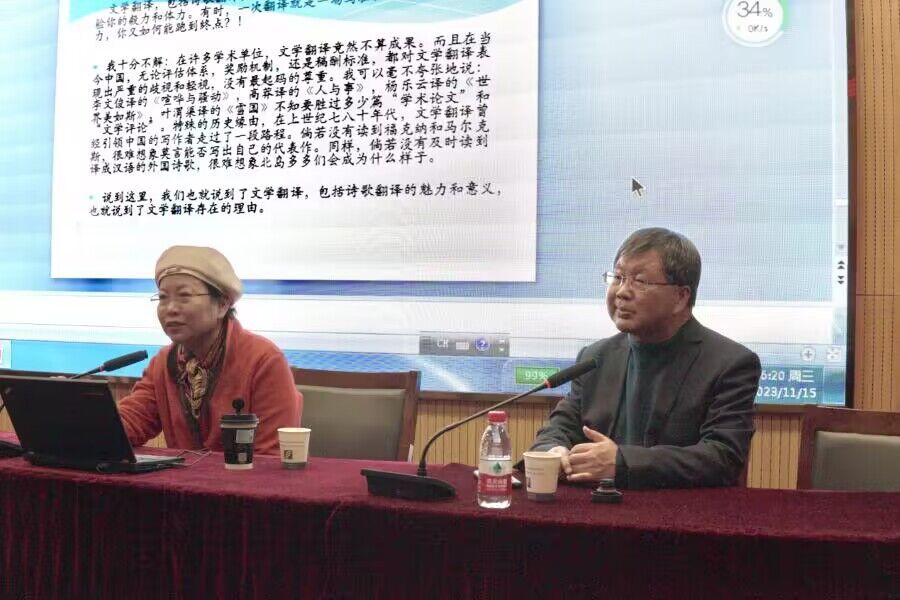 2023年11月15日下午,“文学翻译:在有限和无限之间”讲座在随园校区电教楼101报告厅成功举办。本次讲座邀请诗人、翻译家、博士生导师、中国作家协会全委会委员、《世界文学》前主编高兴为主讲人,同时邀请中国外国文学学会理事、《外国文学动态研究》前主编苏玲为与谈人。