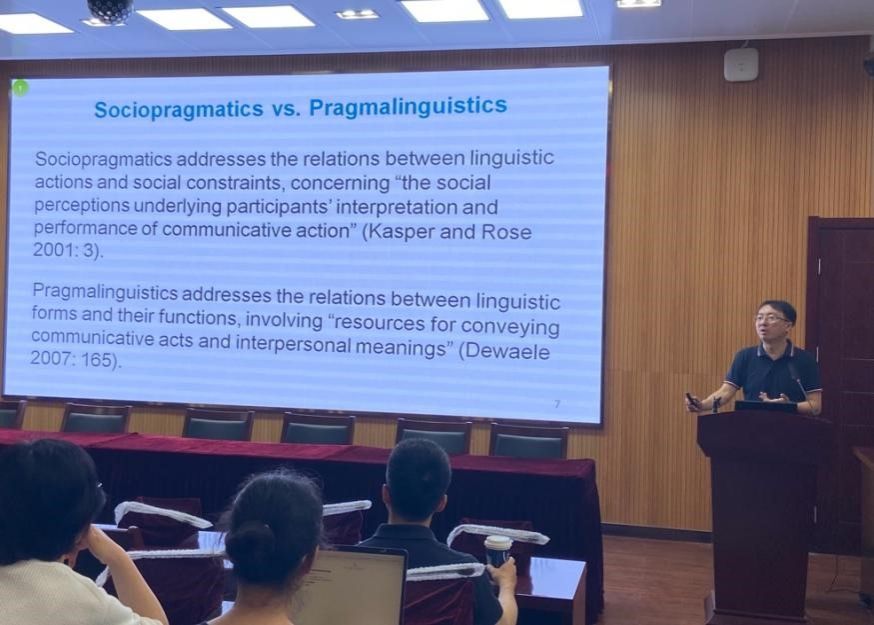 讲座伊始,任教授首先剖析了语用学的基本定义,梳理了社会语言学和语用语言学的几大区别,他不仅从学术研究的角度逐字解读,还对于每一种定义阐释进一步举例说明,由此引出了语用能力的概念,进而阐释了二语习得中关于语用能力的研究现状,包括目前研究的课题、方向以及存在的问题。任教授以幽默风趣的语言,给同学们生动形象地展示了语用能力在生活中运用的实例。