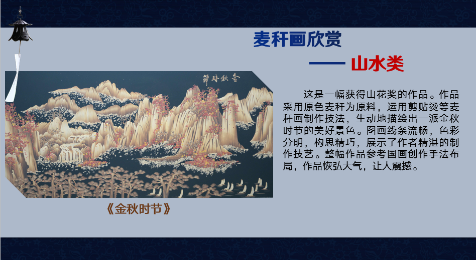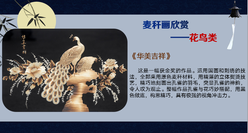麦秸画又称麦草画、麦烫画等,是一种洋溢着浓厚乡土气息的中国民间剪贴艺术,象征着吉祥和丰收。它利用麦秸自然光泽和抢撕成丝的特性,经烫色或染色,用“撕、剪、刻、抢”等特技工艺,或平贴,或直接用麦秸逐层贴堆而成画面。