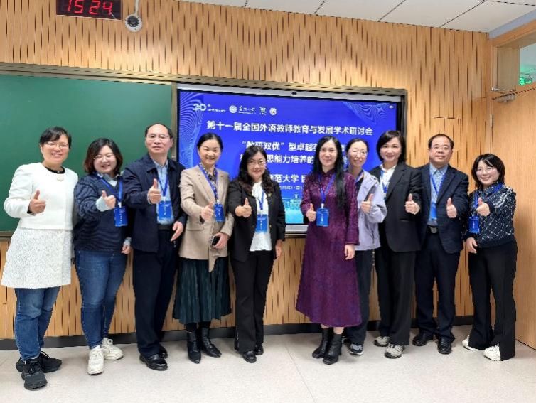 、上海外语教育出版社联合承办的“第十一届全国外语教师教育与发展学术研讨会”。11月1日下午,老师们在苏州大学博远楼进行的团队展示环节,围绕“‘教研双优’型卓越英语教师批判反思能力培养的实践探索”主题,与来自全国高校的教师进行了深入的学术交流。其系统化的培养路径与丰硕的实践成果,赢得与会专家学者的广泛关注与高度认可。