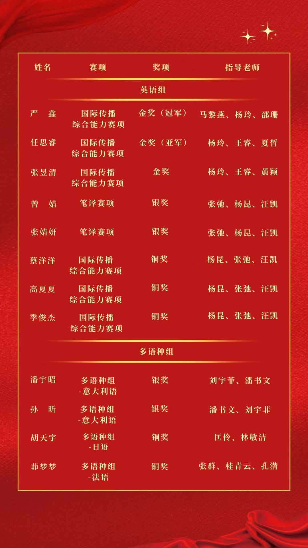 将继续立足教育强国建设目标,融入国家发展大局,落实立德树人根本任务,为开拓高等外语教育新局面注入强劲动力,助力更多外院学子登上全国舞台,讲好中国故事、传播中国声音!