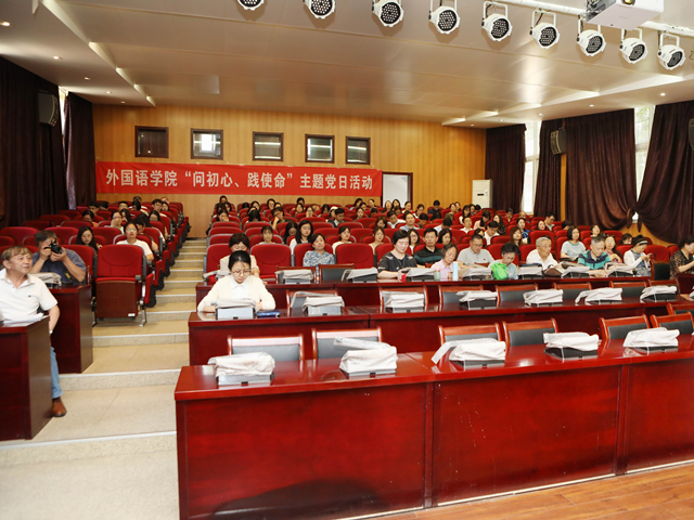 接着,离退休老党员代表朱淑琴和刘海峰老师、在职教师党员代表张辉老师、王宇熙老师以及研究生党员代表马明宇分别围绕着“问初心,践使命”的主题,向全体参会党员分享了他们的“初心”故事。朱淑琴老师当年无论是在高校工作,还是下放农村务农,都一直以共产党员的标准严格要求自己,发挥共产党员的模范带头作用,并且一直坚持着“一切依靠党,依靠组织,依靠群众,做群众的知心朋友”;刘海峰老师分享了当年在法国进修和参与法国“孔子学院”的建设工作经历,他说,作为当时法国阿尔萨斯大区孔子学院院长,作为一名共产党员,为推广祖国语言、传播中国文化,弘扬中国精神,无私奉献,无悔无怨,因为这一切都源于坚定的信仰。他向大家讲述了他作为共产党员所践行的信念——“人生的价值在于贡献”;张辉老师作为在职教师的优秀党员代表,向大家分享了他所践行的“老老实实做人,认认真真做事”的人生信条。23年的部队生涯极大程度上锻炼了他,来到皮皮虾