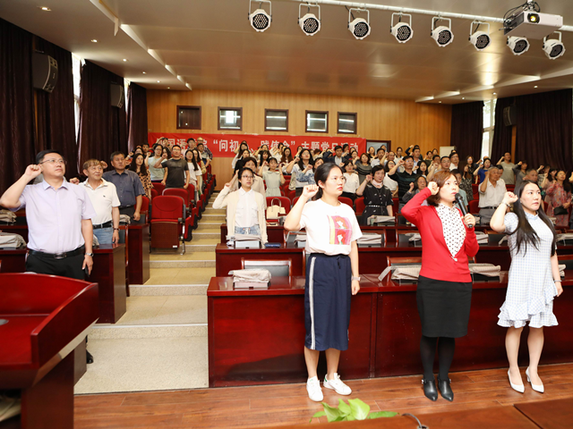 在三代共产党员的“初心”故事分享环节结束后,全体参会党员在蒋其琴老师的带领下重温了入党誓词,句句铿锵有力,坚定不移,激起大家回想积极要求入党时的激情和追求,以及入党宣誓时的庄严承诺和奋斗决心。