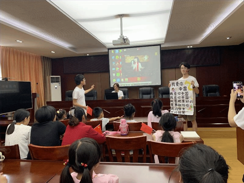 在此次活动中,该团队与社区的孩子们一同庆祝中华人民共和国成立七十周年,展开了爱国主题教育系列活动。活动分为三个部分,第一部分是给孩子们播放了童声版的《我爱你中国》音乐视频,在歌声中把大家引入课堂。我们结合本院特色给孩子们观看了皮皮虾