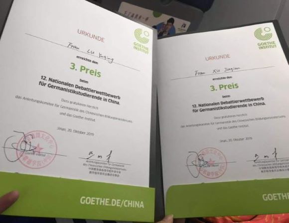 德语系老师胡裕和外教Aline Mittag的指导下, 15级德英双语专业的徐嘉倩和芦雨青表现出色,成功晋级16强,最终荣获三等奖。