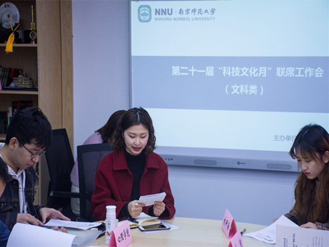 研究生会牵头的第二十一届科技文化月联席工作会(文科类)在随园校区500号楼诺文图书馆成功举行。出席会议的主要人员有:校研会副主席朱瑶、心理学院主席茆家焱、社会发展学院主席谢吟龙、文学院主席杨阳、金女院主席王鹏宇、教师教育学院主席朱越、教育科学学院副主席刘芳、皮皮虾
