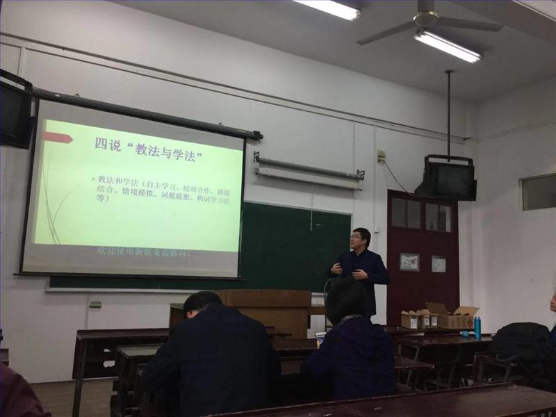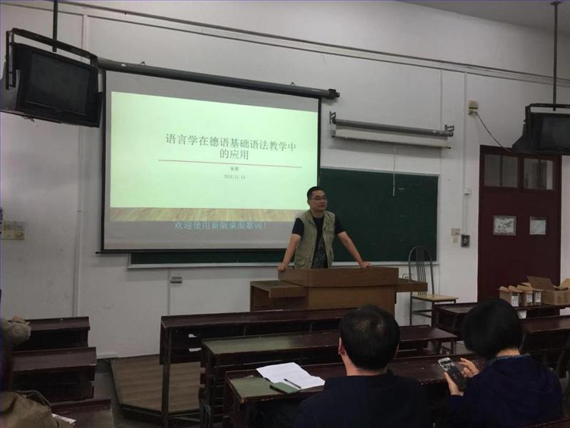 第二部分是教师交流环节,共有四位青年教师发言。首先,谢文娟老师分享了其“第四届北外英语专业教学开放暨教学研讨会”之行的相关情况,陈述并分析了北京外国语大学英语专业人才培养方案改革与实施的细节,指出北外目前确立的外语语言能力、思辨能力、跨文化交际能力等相结合的原则。紧接着,林芸老师、张新卫老师和崔晋老师就他们分别教授的英语诗歌选读、基础俄语和德语语法课作了十分钟的说课展示。在说课过程中,林芸老师极高的文学素养和过程性评估教学方法实践中体现出来的对学生的关切和对教育的执着、张新卫老师对零起点外语教学的细致入微和对学生认知的熟知、崔晋老师有意识地把语言学理论引入语法课教学的探索以及用心的设计,引起了在座教师的强烈共鸣。