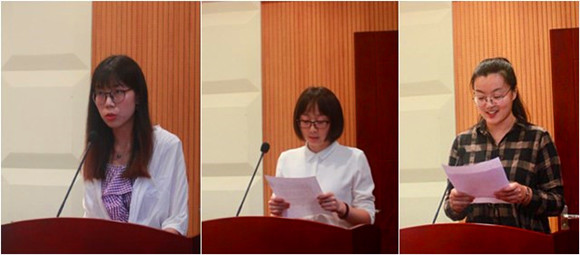 接着,翻硕老生代表冯婷婷同学与大家分享了她自入学起在南师生活的感想,成功没有捷径,鼓励各位同学脚踏实地,用执着和努力来成就更美好的自己。随后,研究生新生代表发言。首先博士新生代表秦彩虹同学对在南师攻读硕士期间导师对自己的培养表示深深的感谢。在品尝过学术的乐趣和苦涩之后,她鼓励各位同窗继续勇往直前,只有竭尽全力的付出才能实现我们追求的目标。然后是硕士新生代表姜亚君同学发言。她代表初入学的硕士新生作出承诺,他们将时刻不忘初心、坚持梦想,在南师期间刻苦学习、修身立德。