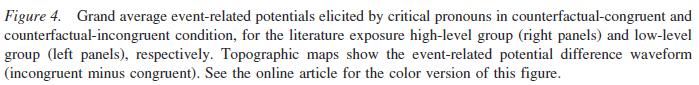 不同于印欧语,汉语缺乏系统的语法化手段(如虚拟语气)来标记违实范畴,往往是通过词汇、语境以及语用推理等来达成违实义,并具有强烈的情感倾向(遗憾、庆幸等)。因此,汉语违实义的理解可能需要更多的调用人的社会认知能力。为此,本研究采用事件相关电位技术(ERPs)首次探究了汉语违实语境对语篇回指的影响,并探讨了个体文学阅读经历对这一效应的调节作用。研究人员分别招募了两组不同阅读经历的读者接受测试,其中一组经常阅读文学小说,而另一组则较少阅读文学小说。研究结果显示,对于较少阅读文学作品的读者来说,性别错配的代词(“…王刚出国念书了,她毕业后将在国外找工作”)在三种条件句(因果vs. 假设vs. 违实)中均引发了P600效应。然而对于经常阅读文学作品的读者来说,代词错配仅在因果、假设条件句中引发了P600效应,违实条件句中(“要不是王刚出国念书了,她毕业后将在国外找工作”)该效应消失,甚至在晚期窗口引发了极性相反的负波。这一研究发现表明:1)不同于因果句和假设句,违实语义加工过程中构建的双重心理空间拓展了句子的表征空间,其丰富的语用意义将引导并鼓励读者从文本之外寻找性别错配代词的所指,从而消解指代问题;2)违实语境对代词回指的影响受到个体认知能力的调节。具体来说,文学阅读将提高违实思维能力,因而经常阅读文学作品者更善于拓展语篇表征,进行多种回指解读,对回指对象有较大的包容性。文学阅读量少的读者在回指加工中并未受到违实语境的影响来扩展语篇模型,而是习惯根据表层信息构建单一表征,尝试在代词与先行语之间建立同指关系。该研究首次探究了汉语违实语境下的语义加工机制,并从神经机制层面揭示了文学阅读对人认知能力发展的现实意义。