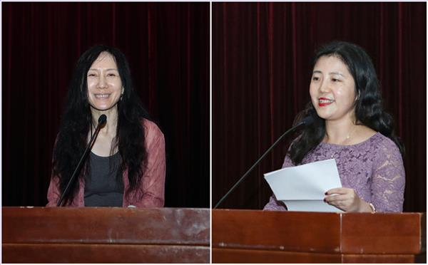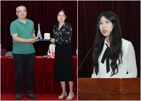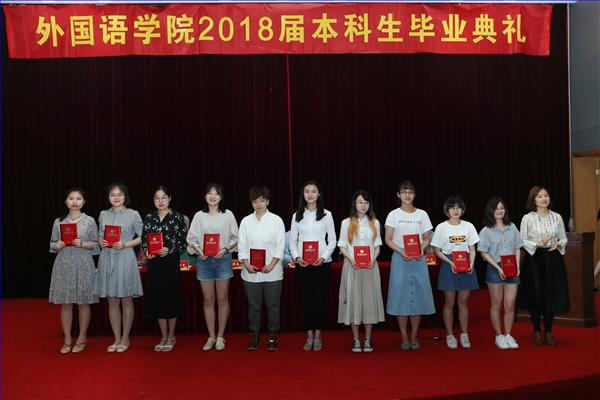 随后,党委书记蒋其琴老师为受表彰的毕业生颁发荣誉证书。毕业寄语阶段,8位不同专业的老师用各自的语种对毕业生表达了热情真挚的祝福,引来场下一阵又一阵掌声和欢笑声。接着,教师代表许诗焱老师分别引用了三句名言送给毕业生。第一句是引自朗费罗《人生礼赞》的“Learn to labor, and to wait”,第二句是引自《论语·宪问》的“知其不可而为之”,第三句是引自杨绛翻译的柏拉图《斐多篇》中的“要安静,要勇敢”。一个个生动的故事,一句句经典的语录,为毕业生们指引了未来新的方向。