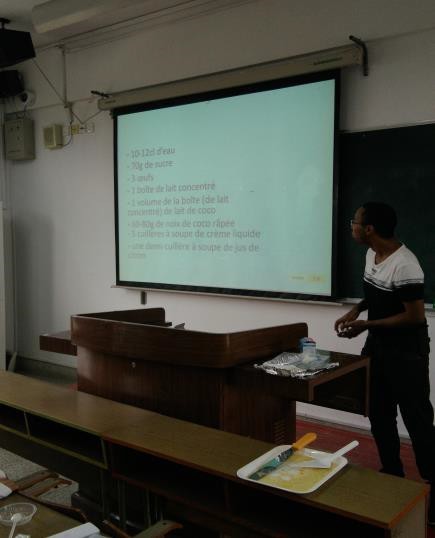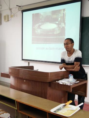 学生就甜品所需准备时间、温度要求、Tiana  对中餐的兴趣以及材料购买地点等提问,Tiana 详细回答并与大家分享了他的美食心得以及美食与文化之间的关系。学生由外教骑自行车去购买食材和工具这一点延伸出来的问题是关于法国公共自行车的问题,外教就此做了说明:法国很多城市因为没有自行车道,且法国人上班地点离住处较远,公共自行车不太流行,虽然公共自行车在法国比在中国开始得更早。