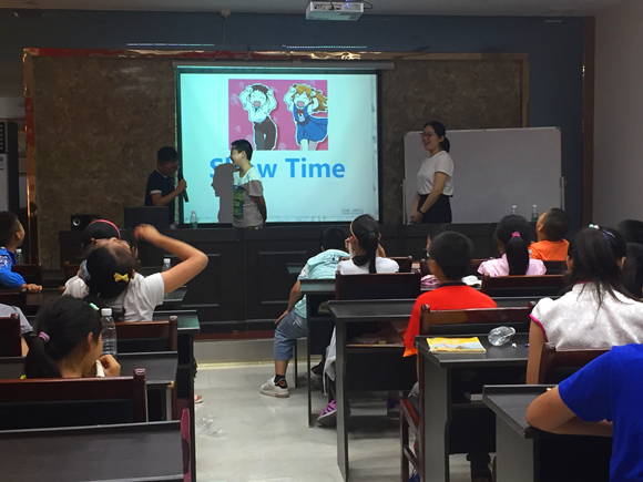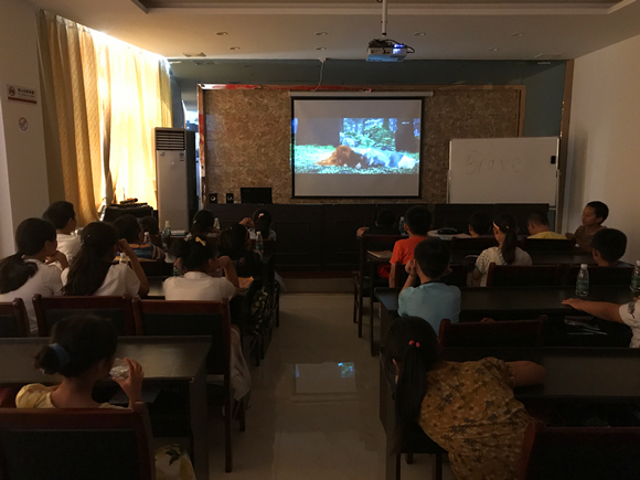 在学习之余,还有形式多样的趣味游戏、英文歌曲教学和电影鉴赏。趣味游戏包括“同心结”、游戏“动物猜猜猜”以及各种单词游戏等。在游戏中,孩子们不仅巩固了所学的单词还增强了团队协作能力。英文歌曲有小星星、You Are My Sunshine等。孩子们对照歌词纸页,一边听王老师逐字逐句地阐释歌词大意,一边在银老师的领唱下,微笑齐唱歌曲。简单易记的旋律回荡在教室里,满是孩童蓬勃的朝气。电影鉴赏也是活动的重要环节,精心挑选的影片各自对应着一个有关成长的主题,能够给孩子们启发性的教育。