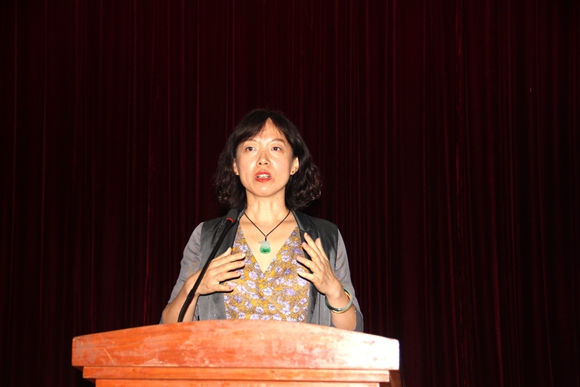 庄严的国歌声里,典礼拉开帷幕。王洪波老师简要介绍到场老师后,英语系主任邵珊老师作为教师代表上台发言。邵老师先向在座新生表达了欢迎,然后从学习、生活、娱乐等多个角度为新生献上来自老师的建议。她呼吁新生珍惜韶光,发现自我,追求梦想,同时能在数字化时代保留内心的宁静。邵老师的讲话语言风趣、贴近地气,搏得了阵阵掌声。