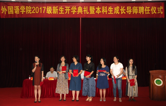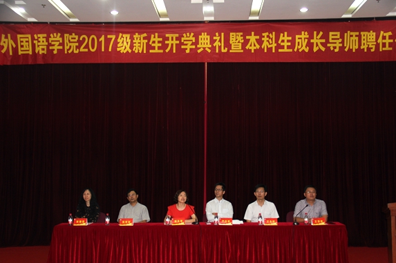 2017级新生开学典礼在敬文图书馆东报告厅举行。外院党委书记蒋其琴老师、院长严志军老师、副院长倪传斌、田朝霞、王永祥老师以及各专业系主任老师、全体辅导员老师出席了本次典礼。典礼由党委副书记王洪波老师主持,全体2017级本科生、研究生准时到场参加。