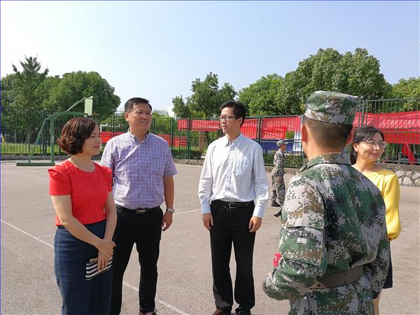 党委书记蒋其琴老师、院长严志军老师、党委副书记王洪波老师,在2017级辅导员李映秋老师的带领下来到东区篮球场,看望正在训练的教官以及外院2017级新生。皮皮虾