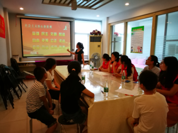 开营典礼伊始,社区老师发表了讲话,介绍本社区孩子们的基本情况,以及少年暑期夏令营老师的组成,其次向师生们展示了社区奉行行的24字社会主义核心价值观“富强 民主 文明 和谐 自由 平等 公正 法治 爱国 敬业 诚信”。她就此次活动的举办表达了热切支持,同时对南师大研究生志愿者的到来表示衷心的感谢。“子衿”少年暑期实践队队长郑文佳就即将开展的为期一周的暑期夏列营课程安排及要求发表讲话,同时表达了对孩子们暑期快乐学习,健康成长的祝愿。在孩子们的热烈欢迎中,“相伴子衿 守望成长”少年暑期夏列营开营仪式顺利拉开了帷幕。