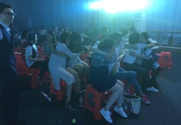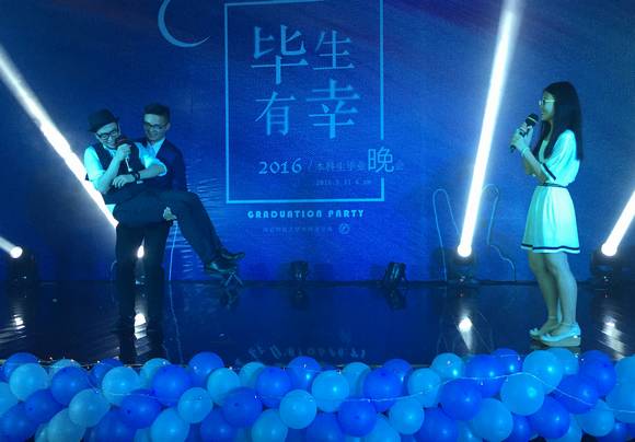 毕业晚会自然少不了互动环节。现场第一轮互动环节“谁是大歌王”,连2011级的辅导员蔡健老师都参与了进来。师生一起,同台互动,现场气氛十分活跃。而第二轮互动环节“真心话大冒险”更是牵动了台下所有观众的心。面对卡片上层出不穷的新奇要求,全场观众兴致愈发高昂,气氛更加活跃起来。让人印象深刻的是,其中一张“大冒险”卡片上写道:“在座观众相邻两人互相拥抱十秒。”主持人读完这句话后,同学们或羞赧,或自然,却都伸开手臂拥抱了邻座同学。拥抱的温暖,也是深厚情谊的温度。毕业之际,分别即将来临,但只要情谊还在,心便不会散。