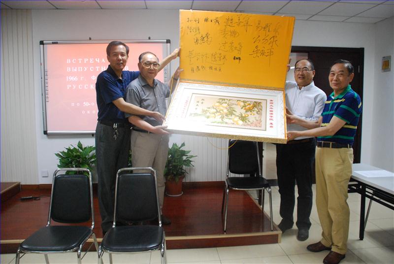 所在的700号大楼,参观了院史馆,他们对近年来外院的快速发展和取得的成绩感到骄傲和自豪。校友们说,我们从祖国各地向南京奔跑,亲吻着美丽随园的一廊一草;因为,我们要把珍藏半个多世纪的老照片,献给心目中高山般的母校......一部由校友收集旧照片自制的PPT将气氛点燃。学院党委书记钱建和亲切接见了全体校友和老师,共话自母校毕业后丰硕的人生;院长张杰介绍了学院的发展思路和取得的长足进步,真诚地邀请各位校友常回家看看。为了表达对母校的建设、发展的支持,66届俄语专业的校友向学院以及老师献上了礼物,同时学院领导也向校友赠送了院史画册。最后,学院领导和校友们在学校的大草坪上合影留念。