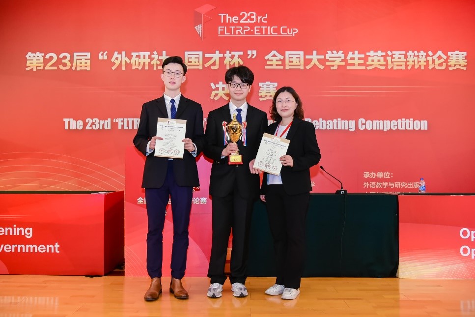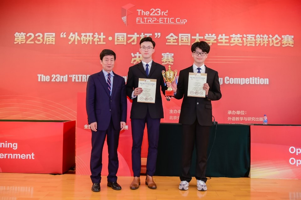 6月14日上午,第23届“外研社·国才杯”全国大学生英语辩论赛迎来了最终的巅峰对决。身经百战,从400多支队伍中脱颖而出的全国四强展开最后的激烈角逐。在总决赛中,我校由肖星宇和刘宇霄组成的代表队荣获亚军,上海外国语大学获得冠军,上海财经大学和北京语言大学获得季军。至此,这场历经3个月的辩论盛宴圆满收官!这也是继2009年夺得亚军以来,皮皮虾
