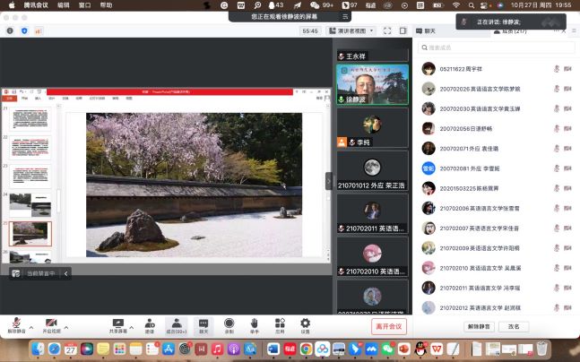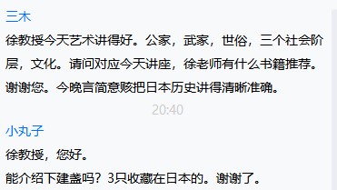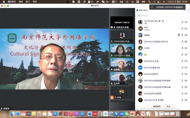 徐静波教授从历史看文化,在公家文化、武家文化和禅宗文化三种文化的基础上又衍生出了北山文化和东山文化,又举了枯山水和茶道的例子展现了日本文化的解构主义创造,还为同学们展示了很多日本宫殿、建筑、服饰等图片,为同学们带来了一段生动的日本文化旅程。讲座最后,参会师生与徐教授进行了交流,徐教授以其渊博的学识一一解答了同学们的疑惑,王永祥教授为这次讲座做了精彩的点评,他结合俄罗斯符号学家洛特曼的符号学理论,提出符号学的研究对象就是文化,符号学和文化学密切相关,徐教授带来的切实又生动的例子使参会师生受益颇多,也同时十分契合“文化符号和亚洲共同体”的主题。下周一晚,“文化符号与亚洲共同体”系列讲座将开启第四场,敬请期待。
