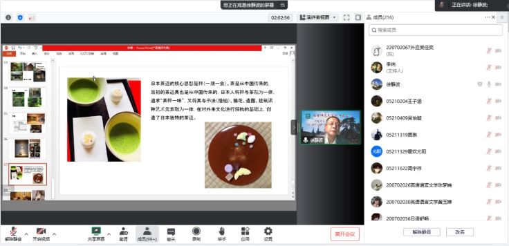 徐静波教授又通过枯山水和茶道的例子,为大家生动阐述了日本文化的解构主义创造。徐教授引用重森三玲等学者的名言,展现了中国禅宗和宋元水墨画对枯山水的影响,同时指出枯山水是日本人在解构外来文化的基础上独创的产物,并向同学们展示了徐教授曾亲手拍摄的京都龙安寺的枯山水美景图。在介绍茶道时,徐静波教授点明日本茶道的核心思想是一期一会的禅意,日本人将从中国传入的茶与禅结合到一起,追求“茶禅一味”,又将其与插画、书法、建筑等艺术元素融为一体,形成了日本独特的茶道。