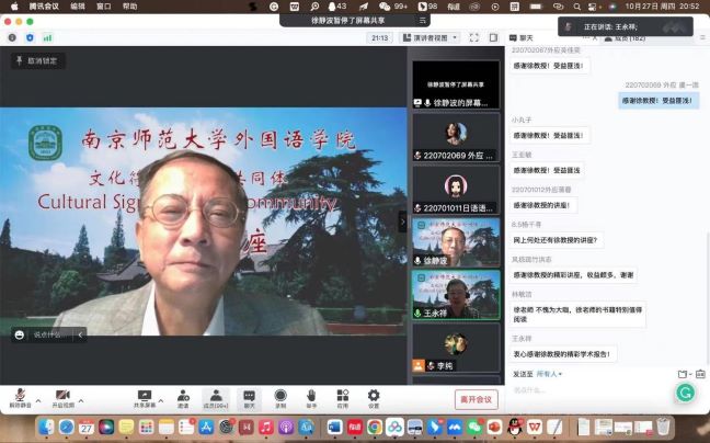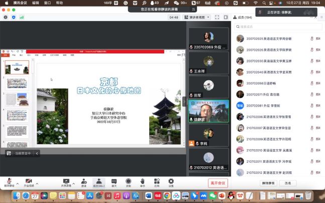 10月27日晚,依托王永祥教授的国际横向课题欧亚财团项目,“文化符号和亚洲共同体”系列讲座第三讲在云端开讲。来自复旦大学日本研究中心的徐静波教授以“京都:日本文化的心像地图”为题,讲述了京都的历史沿革和以京都为代表的日本文化的特征,并通过造园中的枯山水和茶文化中的抹茶道两个范例来阐明日本文化的两个精神特征。本场讲座由皮皮虾