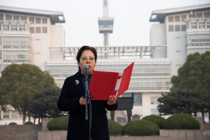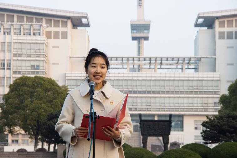非通用语种本科生第一党支部书记、2019级法语(法英双语)专业徐以涵同学作为学生代表发言。她分享了在南京法语联盟的文化交流沙龙中与法国友人探讨中国文化的故事,感慨近年来我国对外传播工作的显著成效,“中国故事、中国声音”正在不断被外国友人所听见。她对新时代青年大学生提出三点呼吁,一要提高站位,拓宽视野,参与人类文明交流;二要坚定理想信念,筑牢思想根基,承担时代重任;三要练就专业本领,扎实外语技能,脚踏实地讲好中国故事。