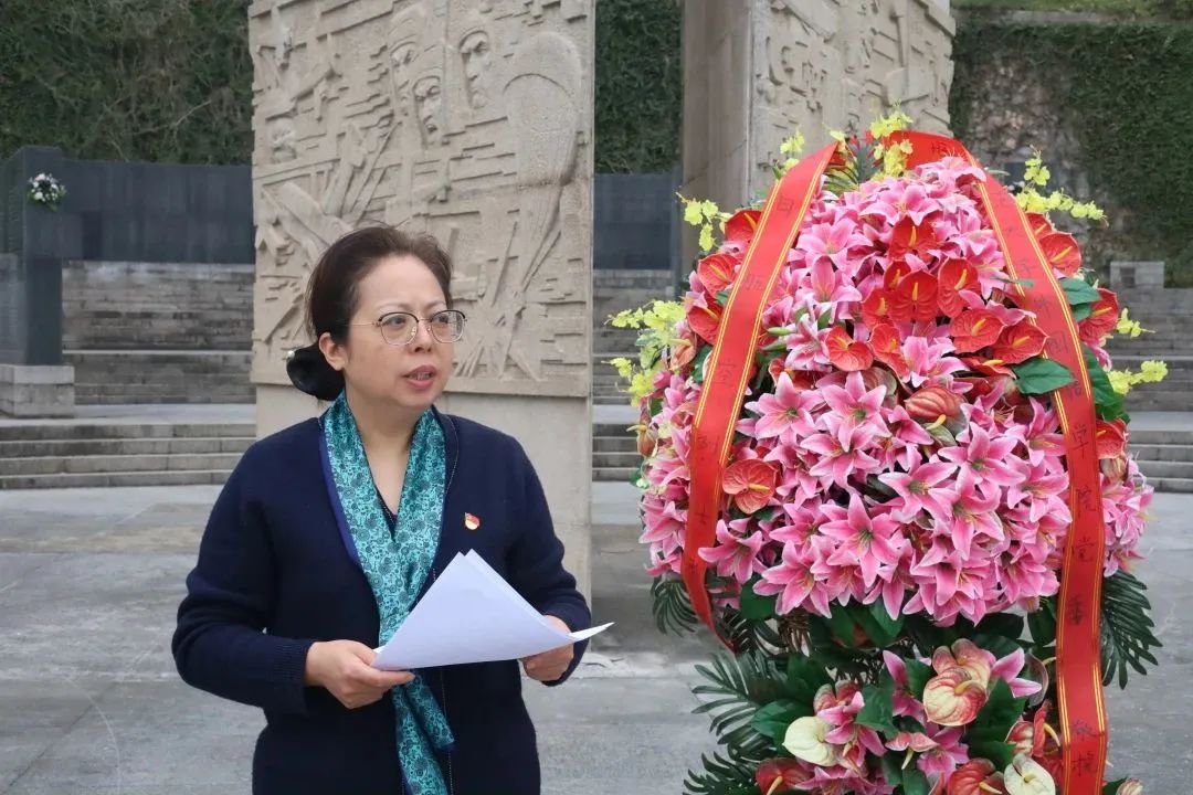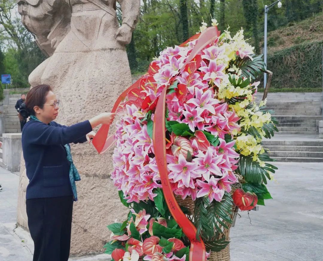 党委书记孙绪敏仔细整理花篮上的红色缎带,向革命烈士敬献花篮。随后,全体党员一起瞻仰了革命烈士纪念碑,并步行至无名烈士陵墓,献花鞠躬,表达缅怀之情。