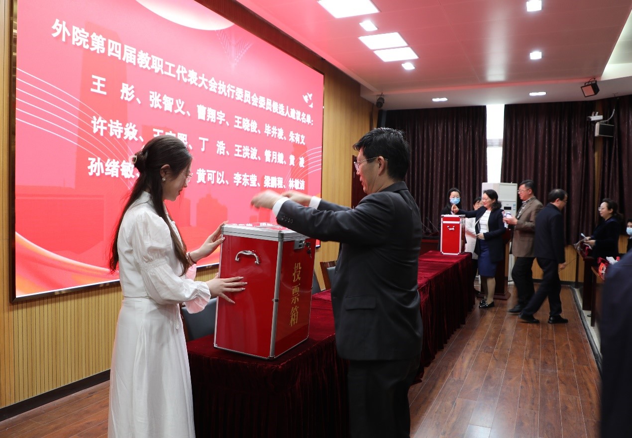 教代会的工作在过去几年取得的优异成绩,希望大家积极履行代表职责,发挥好桥梁纽带作用,为学院和学校的事业发展贡献智慧和力量。随后,王永祥院长作学院工作报告。他在报告中总结了过去几年来的工作,并提出了下一步的主要奋斗目标和思路。王洪波副院长作了学院财务工作报告,工会主席王彤作了学院工会、教代会工作报告。会议还进行了代表团分组讨论审议。各位代表积极履职,审议通过了三份报告以及学校“两代会”代表候选人和学院第四届教代会执委会委员候选人及选举办法。代表们畅所欲言,会场气氛格外热烈。接着,代表们根据会议安排,投票选举产生出学校“两代会”代表19人和学院第四届教代会执委会委员15人。当大会总监票人徐丹宣布选举结果时,会场上响起了热烈的掌声。