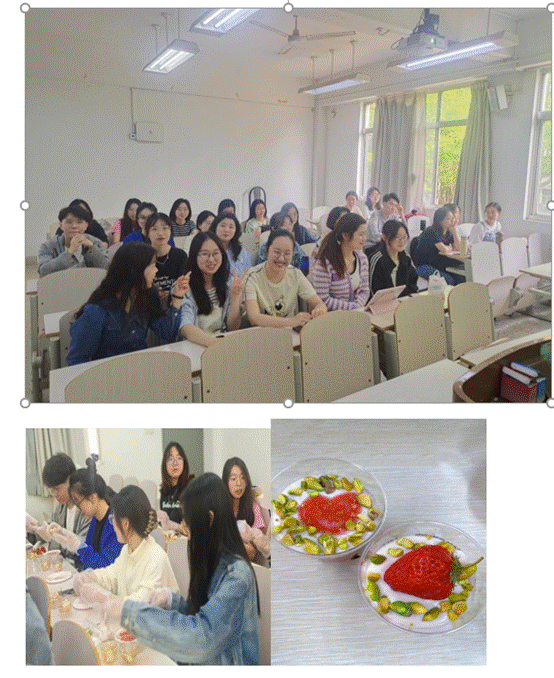 本次活动以草莓为主题,Tiana老师事前做了精心的准备,食材、工具等一应俱全。活动开始后,同学们首先将草莓清洗干净,在老师的帮助下榨取草莓汁,装入小碗中备用。随后,每位同学领取了手指饼干、草莓和特制奶油,将所有材料在杯子中层层叠加起来。为了给甜品增加亮点,同学们创意频出,用草莓或者开心果碎点缀其上,制作出一杯杯色彩缤纷、口感丰富的草莓甜品。品尝之后,大家围绕甜品的名字进行小组讨论,提出了“草莓浆浆杯”“Rose”等富有想象力的名字。最后,Tiana老师公布了这道甜品的法语命名,即“verrines roses”或“verrines aux fraises”,并列出了制作过程中涉及到的法语单词,寓教于乐。活动现场气氛活跃,同学们积极参与、齐心协力、互帮互助,欢声笑语此起彼伏。