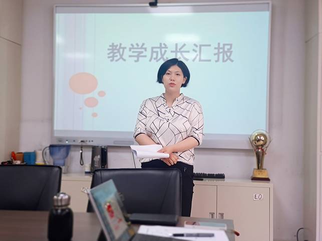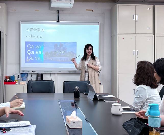 接着,两位新教师简短地汇报入职以来的心得体会,并进行了十五分钟现场教学。专外法语系新教师黄可以老师以《法语音素[a][ε]》为主题,从音素概念剖析、发音规则讲解、例词带读、实景练习等方面进行现场教学。在教学中,黄可以老师明确展示了教学目标设定、内容设计、方法选用、组织开展等内容。