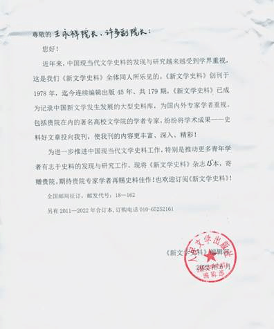 编辑部同时给院长王永祥教授、副院长许多教授发来公函,对《新文学史料》作了简单介绍,表达了他们这次寄赠刊物的意愿。