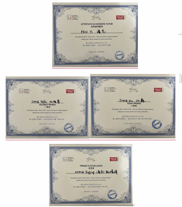 意大利语系19级本科生江娅菲和22级研究生江鑫分获本科组二等奖和硕士组三等奖,19级本科生张婧婧同学获得优秀奖;潘艺老师获优秀指导教师奖。比赛旨在通过意大利语推广意大利在各个方面的可持续发展文化,比赛期间,意大利驻华使馆文化处组织了围绕“意大利语与可持续性” (L’italiano e la sostenibilità) 这一主题而展开的意大利语写作比赛,大学组赛事分为两个主题,分别是纪念卡尔维诺诞辰100周年和罗马申办2030世博会。