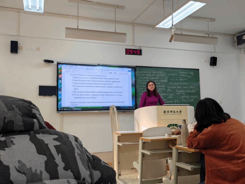 On November 7, 2023, Yulia, an expert in Russian language teaching, gave a lecture to the students majoring in Russian at Nanjing Normal University in Xueming Building. The topic of the lecture was “Overview of contemporary Russian social problems”. In the lecture, Yulia introduced the problems of education, employment, marriage and love in Russian society by using videos and pictures, she also kindly and actively interacted with students. The lecture was a great success and the students gained a lot from it. (供稿人:皮皮虾