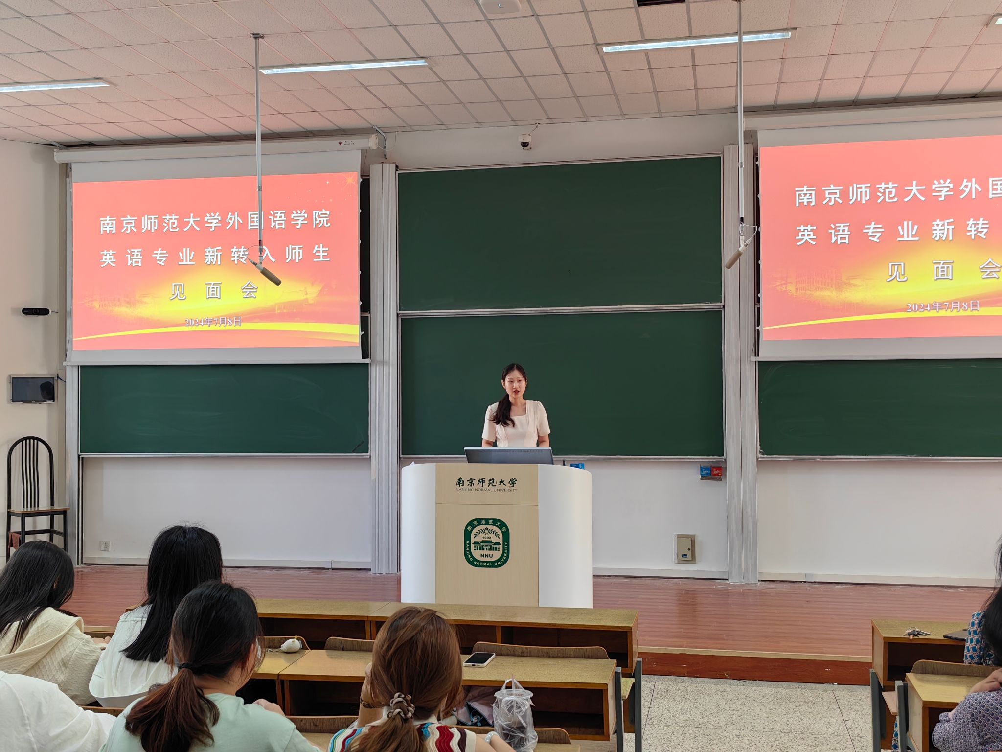 副院长田朝霞介绍了英语专业的相关情况及培养特色,特别是对课程设置、教学衔接、师生互动等方面进行了详细的解读;学生工作办公室副主任李娜老师从思想引领、组织建设、学风建设、心理健康教育、就业工作、社会实践、日常管理、辅导员队伍等8个方面介绍了外院学生工作的整体情况;新转入学生代表、2022级张艺璇同学在发言中表达了对金女院的感谢和对外院新生活的期待。