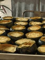 活动伊始,外教Tiana介绍了本次美食工坊的主题----法国传统甜点制作:奶酪南瓜舒芙蕾(Courgette soufflée au fromage)和烤李子酥(Crumble aux prunes)。接着在Tiana老师的细心讲解下,同学们首先制作了奶酪南瓜舒芙蕾。老师用法语介绍了每种食材的名称和用量以及制作步骤。从切开南瓜、去籽、打发蛋清,再到制作奶油、奶酪和面粉的馅料,大家一边动手操作,一边用法语与老师们交流。馅料调制完成后,同学们将其倒入焯熟的南瓜盅中,并加入适量盐、蒜粒、胡椒粒和普罗旺斯香料调味,最后放入烤箱。舒芙蕾出炉后,同学们搭配了一些沙拉、核桃仁和切半的葡萄装盘,迫不及待地品尝自己的劳动成果----口感绵软细腻,奶香四溢,大家纷纷赞叹:“C’est délicieux!”